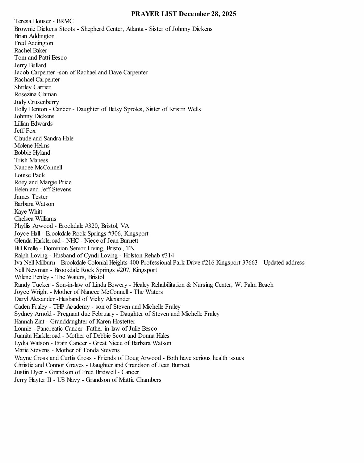 Prayer List: December 28, 2025 *the prayer list is updated every Friday