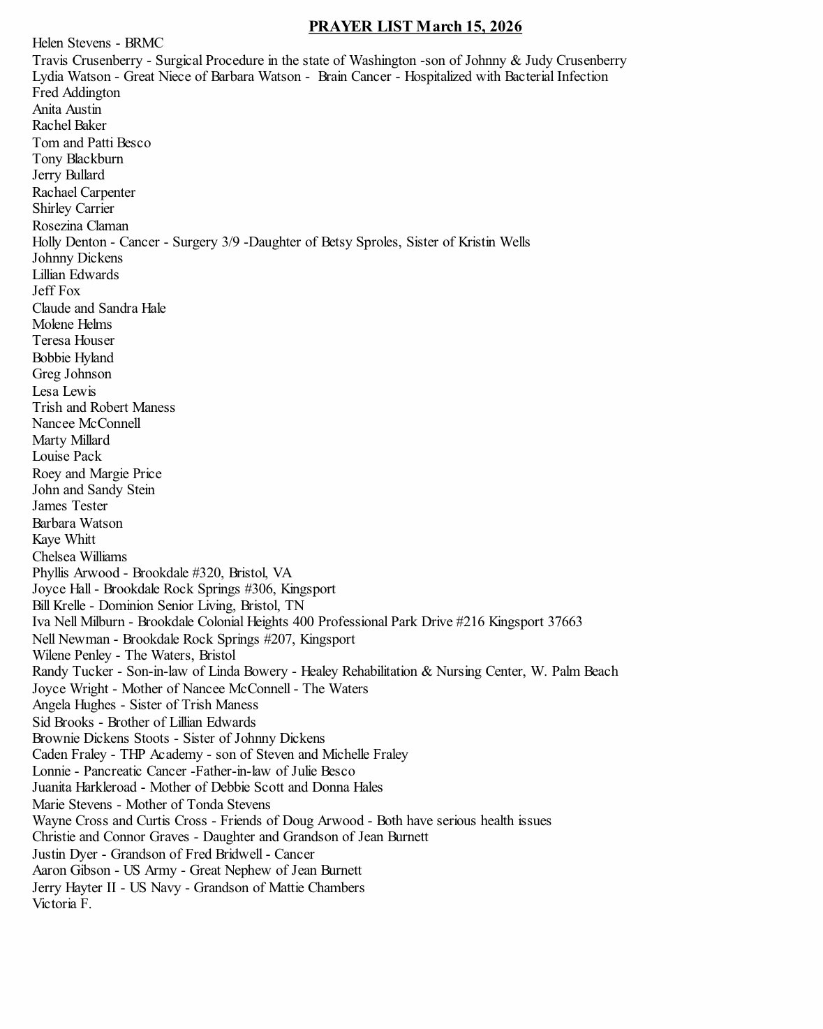 Prayer List: March 15, 2026 *the prayer list is updated every Friday