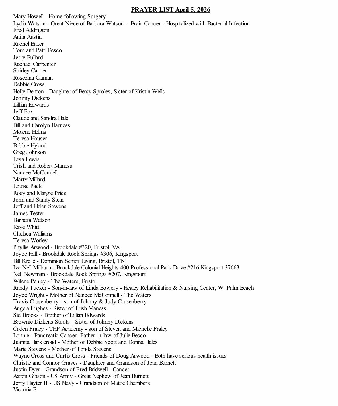 Prayer List: April 5, 2026 *the prayer list is updated every Friday